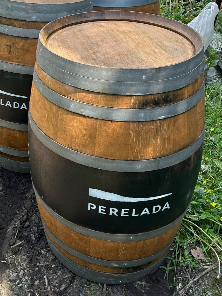 Frans eiken. Ze zijn gelakt en voorzien van het Perelada logo. Door de bewerking met lak kunnen ze goed buiten staant. Ter beschikking gesteld door onze wijnleverancier Noordman.